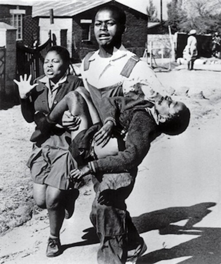 When the students reached Orlando West High School, they were confronted by a battalion of police officers. One white policeman hurled a tear gas canister into the crowd and then pulled out his pistol and opened fire. Several other officers followed. The barrage of bullets struck and killed a 12-year-old boy, Hector Pieterson. His lifeless body, cradled by an older student, was photographed by journalist Sam Nzima, and that photograph (below) soon became the defining image of the Uprising.